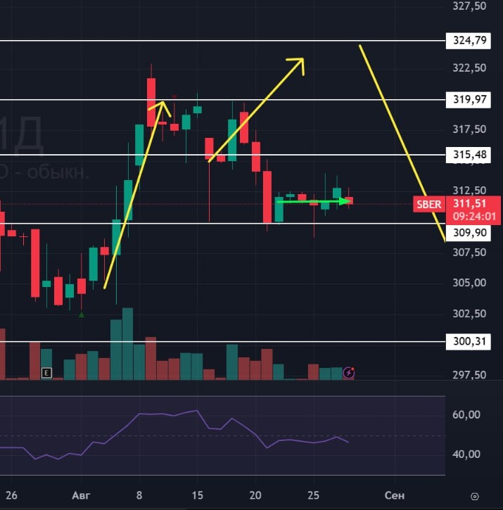 В ответ на пост 🏦 #Сбербанк $SBER #bogdanoffinvest 🟢Вчера Сбер делал попытки выйти из накопления вверх, в настоящий момент видим 7 дневок вправо. 🚗 Скоро будет выходить из накопления! Я жду выход вверх на любой позитивной новости по переговорам или очной встречи Путин-Зеленский или Путин-Трамп. Сливать рынок перед потенциальным миром инвесторы не будут, а рост может быть только на сильном допинге. Сидим ждем. Рынок уже который день без объемов болтается.
