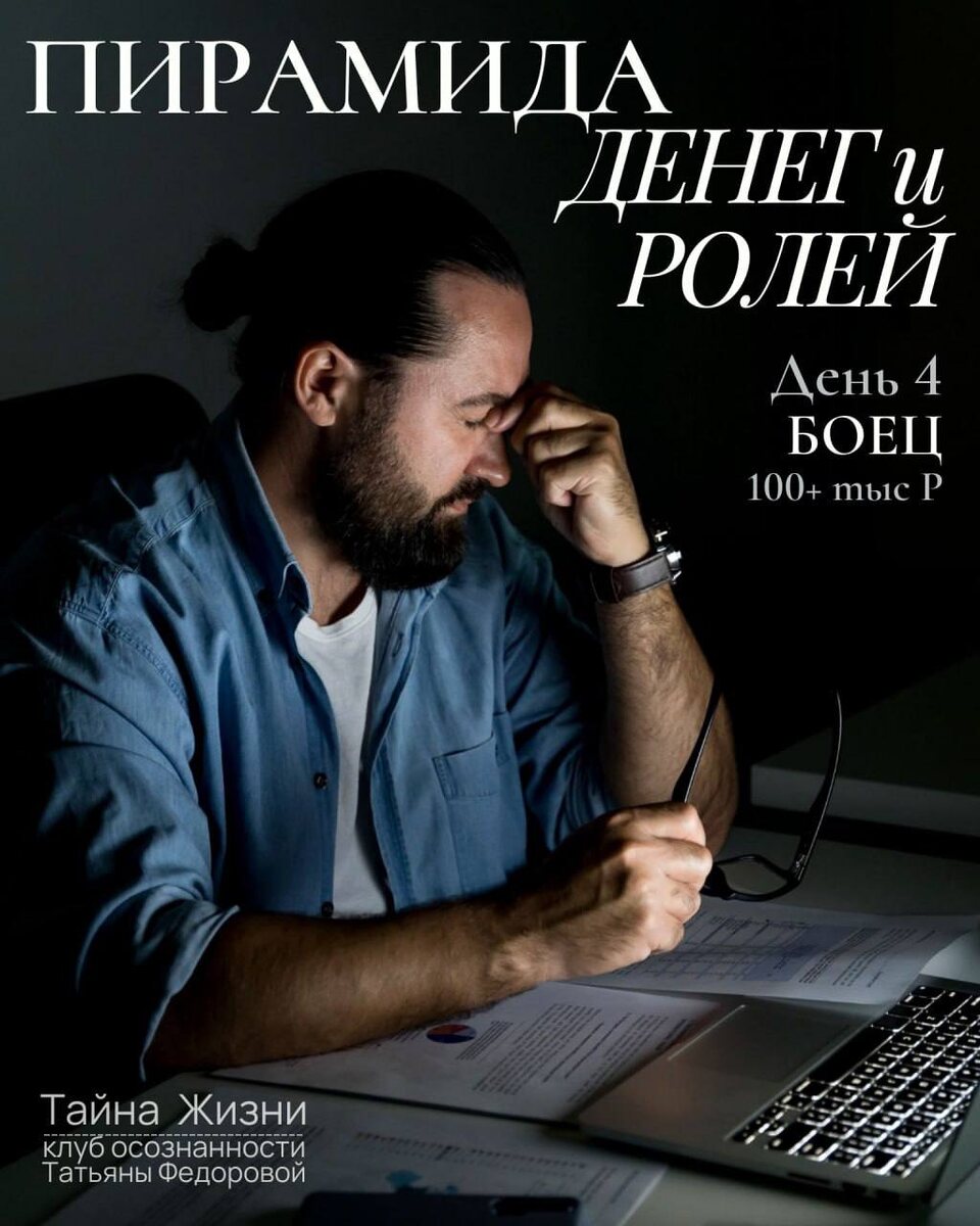 ПИРАМИДА ДЕНЕГ И РОЛЕЙ 🔹 День 4 Боец (100 000 ₽+) Пример: — Ты выглядишь уставшей, может, пауза? — Не могу, надо доделать! Пока не закрою — не остановлюсь. Боец живёт напряжением: работа = результат. 💸 Деньги есть, но ценой здоровья и отдыха. Вопрос: Где в твоей жизни ты до сих пор зарабатываешь «через силу»? Практика: Найди сегодня один процесс, где ты давишь, и задай вопрос: «Как это можно сделать легче?»