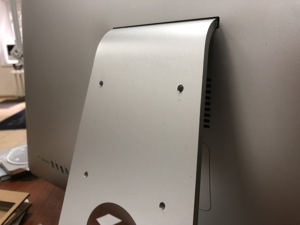 Когда ооооочень хочется повесить iMac на стену, но заморачиваться установкой штатного VESA-адаптера нет желания, то дрель и толика
