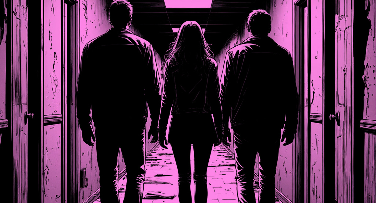 Мы втроём бросились бежать по коридору, отчаянно пытаясь скрыться от того, что мы разбудили. Моё сердце бешено колотилось в груди, когда я понял, что нас преследуют. Звук шлепающих по плитке босых ног заставлял мои ноги работать усерднее, чем когда-либо прежде.