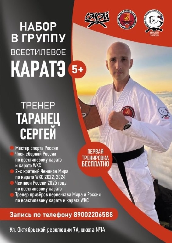 🔥КАРАТЭ в центре Смоленска🔥 Федерация каратэ WKC Смоленской области объявляет набор в секцию для детей с 5 лет🥋 Помимо умения дать отпор хулиганам ваш ребёнок получит: ✅воспитание уважения к старшему поколению, родителям и учителям; ✅дозированную физическую нагрузку; ✅развитие таких качеств как: сила, выносливость, гибкость, скорость; ✅возможность аттестации на цветные пояса (кю); ✅возможность участия в областных, межрегиональных и всероссийских соревнованиях по различным версиям каратэ; ✅возможность участия в летних и зимних спортивно-оздоровительных сборах. Тренировки проводит Таранец Сергей Анатольевич - 3 Дан каратэ WKC, 1 Дан Дзёсинмон Шорин-рю, мастер спорта России по всестилевому каратэ, двукратный чемпион Мира по каратэ WKC, чемпион России по всестилевому каратэ 2025 года. 📍Занятия проходят в центре Смоленска - школа №14, улица Октябрьской революции 7А. Запись по телефону - 89002206588☎️ Реклама, ЕРИД: 2VtzqwTXAa6, СООО СК «Сэнсэй», 6732167584