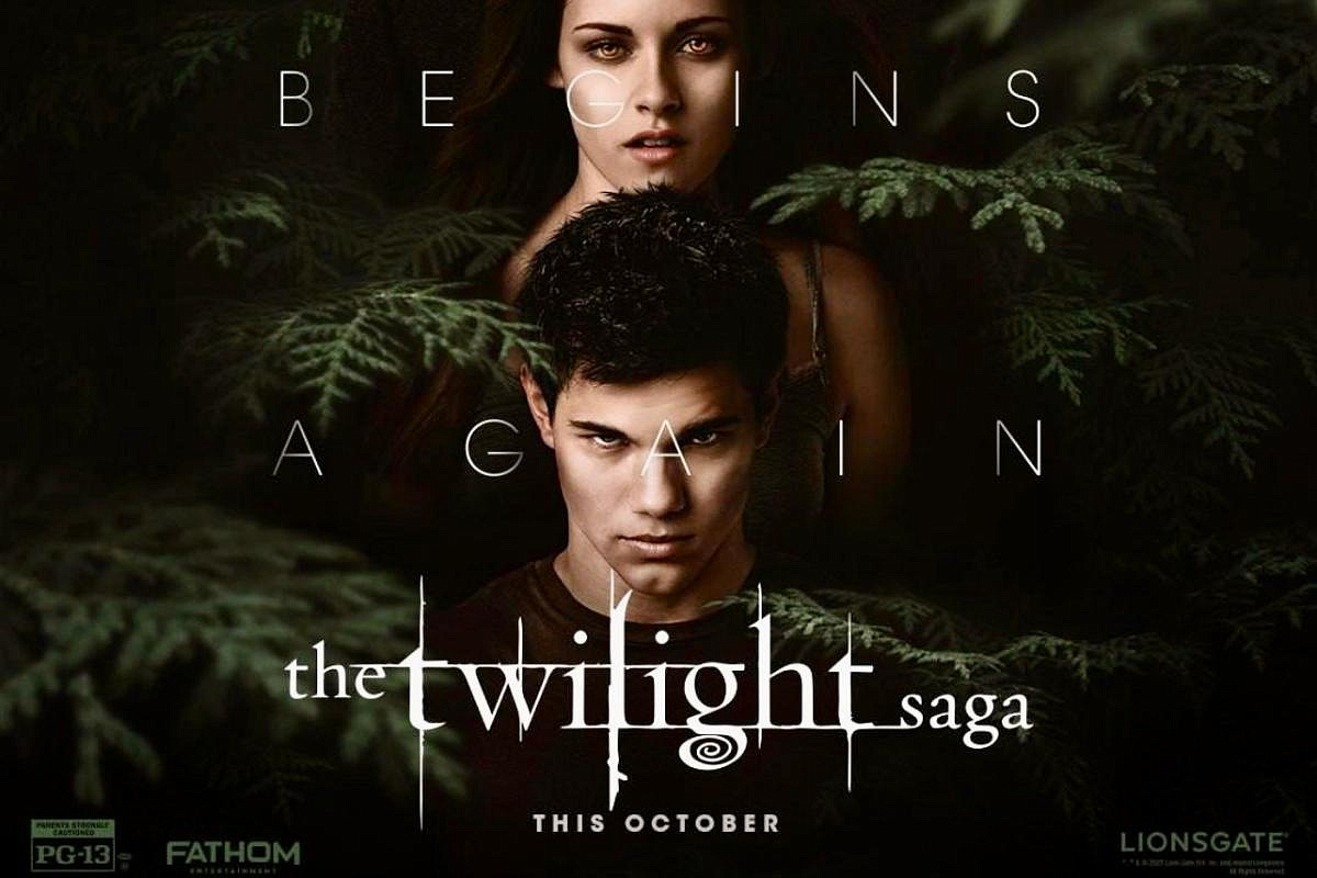 На промопостере — трио Белла/Эдвард/Джейкоб и строка «Forever Begins Again», прямо отсылающая к перезапуску отношений зрителей с франшизой. Окно релиза
