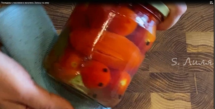 Всем доброго дня! Помидорки сортов "килечки" и "конфета сладкая сосулька" делаю сегодня в желатине. Это один из множества рецептов. Видео: https://rutube.ru/video/7a5a56e5cda6bd5b494b4e70d06bea0e/ На дно стерилизованных банок кладу лавровый лист, перец горошком и орегано. В банки укладываю помидоры как можно плотнее. Чеснок режу лепестками и кладу сверху помидоров. На 5 кг. помидоров: лук репчатый 1шт, чеснок 1 головка большая лавровый лист 1 шт. на каждую банку 1 л. перец черный горошек 5-8 шт. на каждую банку 1 л. орегано на кончике ч.л. или прец душистый 1 шт. на каждую банку Желатин заливаю холодной водой. Крышки прокипячу и оставлю в воде остывать. В кастрюлю наливаю воду примерно половину объема банок. Вода закипела, заливаю банки с помидорами и чесноком, прикрываю крышками и оставляю на 5 минут. Через 5 минут воду сливаю в кастрюлю, кладу в нее головку лука, соль и сахар. После закипания варю маринад на медленном огн