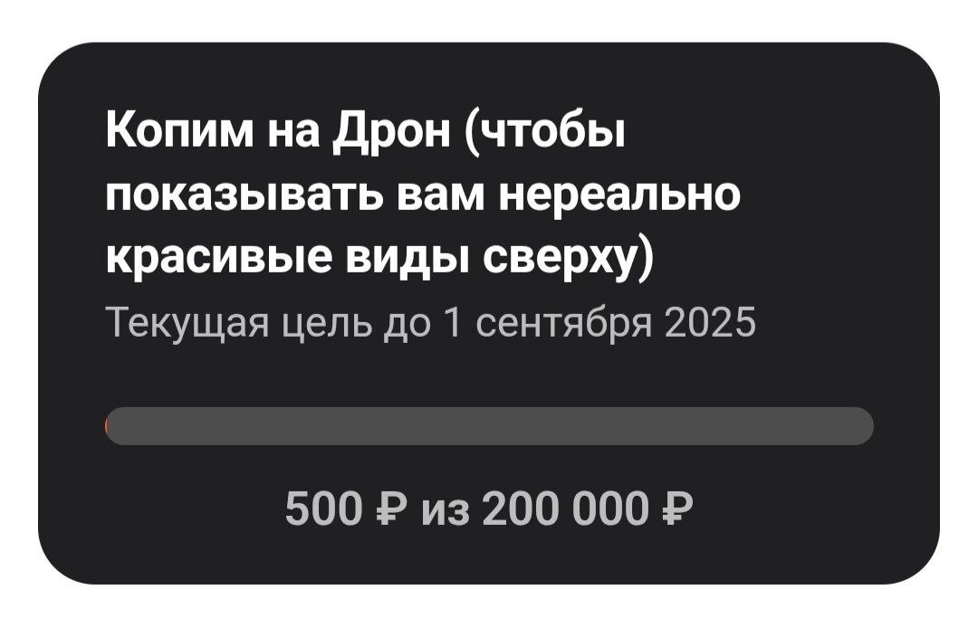 Друзья, хотим поделиться итогами нашего «великого» сбора на дрон. За два месяца мы вместе прошли увлекательный путь к мечте — мечте показывать вам красоту сверху: горы, море, улицы, закаты. Мы представляли, как камера взмывает над городом, а вы наслаждаетесь кадрами, которых нет ни в одном туристическом буклете. Но реальность оказалась куда приземленнее. Из запланированных 200.000 руб. мы собрали внушительные… 500р. Да, именно пятьсот. Однажды кто-то перевёл (Лариса спасибо тебе огромное ❤️), и на этом касса закрылась. Не можем не признать, что такой результат впечатлил нас не меньше, чем сам полёт дрона мог бы впечатлить вас. Похоже, пока полётов не будет. Дрон остаётся мечтой. Но ничего, мы будем продолжать делиться тем, что есть — камера в руках, ноги в пыли, «жопа в мыле», без взлётов и падений. А может, именно так и лучше: честно, по-простому, без лишних иллюзий. Ещё раз Спасибо доброму человеку, который реально скинулся — вы герой, почти Илон Маск среди безмолвной армии зрителей