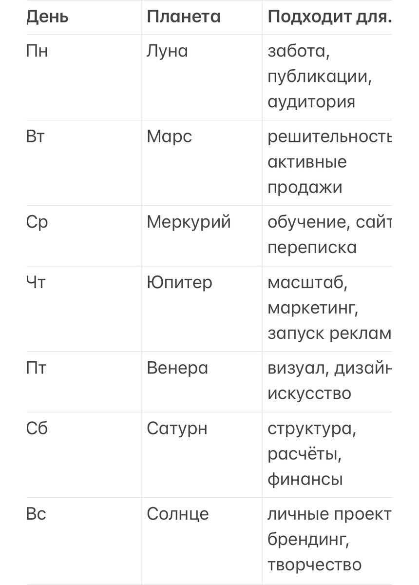 Что влияет на успех проекта? Почему запуск в «плохую Луну» может затянуть процесс на месяцы? Как выбрать день, когда всё само идёт в руки? Эта статья — ваш проводник в астрологическом тайминге: практично, наглядно и с примерами. ✴ Почему запуск важен? В астрологии момент старта — это как натальная карта для проекта. Вы выбираете не просто дату, вы программируете потенциал: 🌙 Этап 1: Луна — хозяйка ритма Не запускаем: Запускаем: Пример: Онлайн-магазин духов, запущенный на 3-й лунный день с Луной в Раке — отлично продвигался через эмоции и сторителлинг. 🌐 Этап 2: Ретрограды — смотрим под капот Нельзя запускать: Пример: Девушка запустила марафон по питанию при ретро-Венере — визуал не зашёл, продажи были слабые, пришлось полностью пересобирать. 🌞 Этап 3: День недели + Солнце Каждый день недели находится под управлением определённой планеты: 🎯 Лучше запускать в будни, чтобы не зависеть от выходной вялости. 🔥 Этап 4: Персональный гороскоп (по желанию) Если хочешь максимум