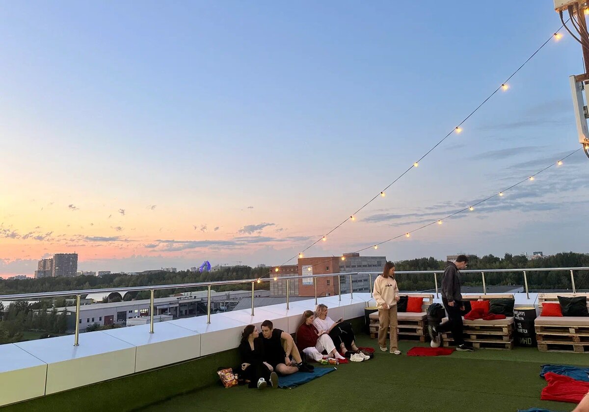 Последнюю неделю лета я решила провести максимально активно и ярко: покаталась на велосипеде, съездила на пляж и посетила необычный кинотеатр. В нем нет ни стен, ни кресел, вместо них – пледы и звездное небо. Кстати, в сентябре еще есть шанс его посетить, а теперь подробности! Кинотеатр Apes находится на крыше спортивного клуба Fitberry. Чтобы попасть наверх, необходимо зайти в фитнес-центр и на лифте подняться на 5 этаж, затем пройти пару пролетов пешком. Виды с крыши открываются волшебные. Город, как на ладони, солнце неспешно садится за горизонт. Особый уют придает освещение: маленькие гирлянды-лампочки. Сплошная романтика! Двери на крышу открывают за полчаса до начала сеанса. Есть время, чтобы выбрать место, полюбоваться пейзажами и сделать фото. Для просмотра установлено два экрана. Зрители располагаются рядом на пледах или паллетах с мягкими сидениями. Покрытие на полу приятное (что-то вроде искусственной травы), так что сидеть комфортно. А можно и лежать – в этом плюс летнего ки