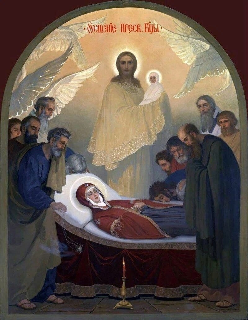 "Тёплый пёстрый платок пахнет ладаном. В церкви - белых цветов кружева. На Успенье нежданно-негаданно Осень тихо вступает в права. Небо в звёздах, большое, бескрайнее Распростёрлось над грешной землёй. Где-то там, далеко, в Гефсимании Плачет ливень о Деве Святой. В город с грустью апостолы сходятся, Чтоб спуститься в ущелье Кедрон, Принести Пресвятой Богородице Самый низкий, прощальный поклон. А заря будет нежной и розовой, И узнает апостол Фома: Матерь Света предстала пред Господом И навеки повержена тьма. Тучи, скрывшие солнце, расступятся, Потому что не время для слёз: За душой Приснодевы-Заступницы С неба снова нисходит Христос. Все деревья охвачены пламенем Золотисто-багряной листвы. Осенивши себя крестным знаменьем, Мы смиренно приклоним главы. И на нас нежным заревом розовым, Белым морем душистых цветов Дева, Матерь Предвечного Господа, Улыбнувшись, опустит покров. Видишь, капель узорчатой россыпью На траве оседает роса? Это тихой, неслышною поступью Матерь Света взошла