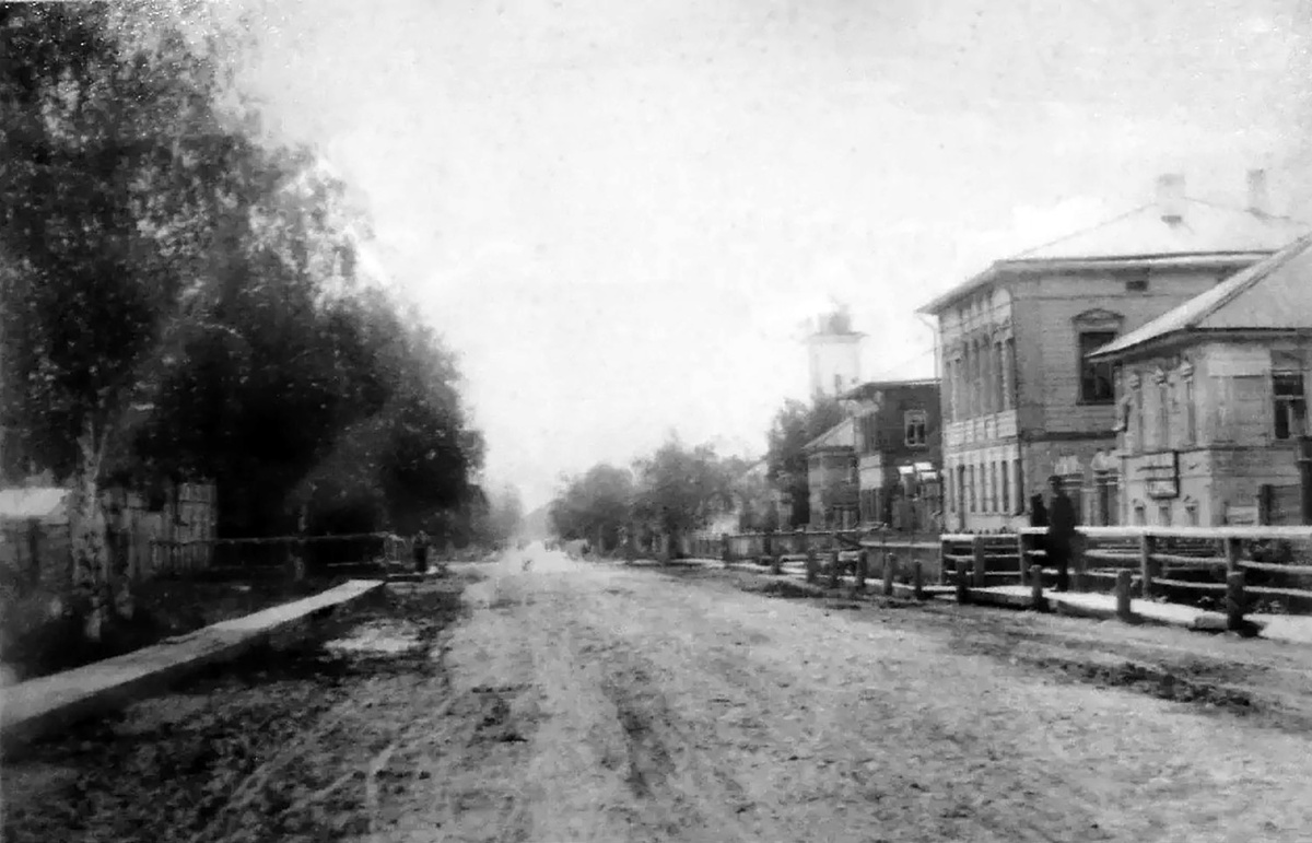 На снимке начала 1900-х годов Большая Козлёнская улица. Побыв в советский период улицей Урицкого сейчас она снова Козлёнская. Над крышами домов видна пожарная каланча полицейского участка I части города, которая размещалась у перекрёстка с современной Пушкинской улицей.