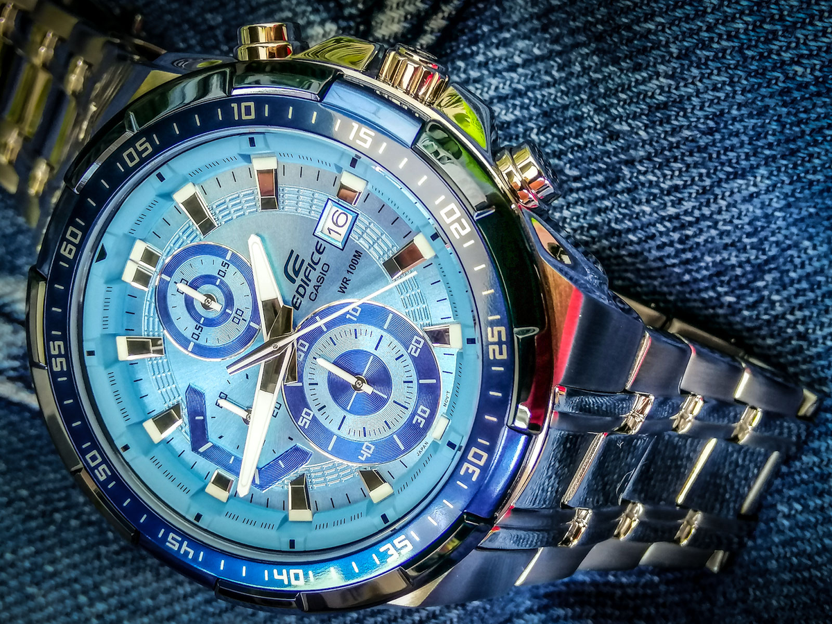 Модели с хронографом создавались для настоящих любителей автоспорта и владельцев стальных коней. Недавно, стоя на светофоре, рассматривал часы на запястье водителя в соседнем ряду. Я почти на 100% уверен, что это была модель EFV-590D-2A, которая выделяется узнаваемыми, далеко заметными красными акцентами и дизайном шкалы секундомера на синем фоне. А со стороны, скажу я вам, эдики на фоне руля выглядят особенно эффектно. У меня в это время на руке были не менее спортивные EF-558D-2AV.