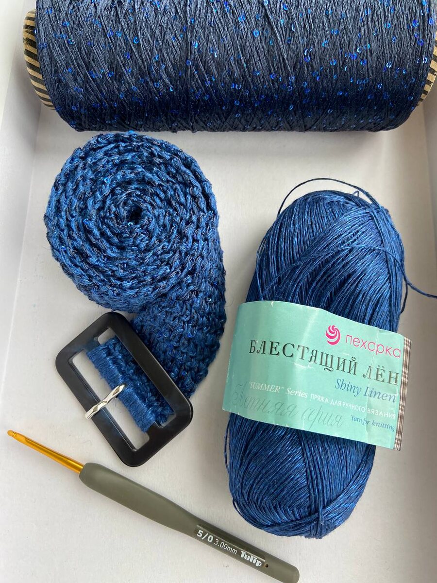 Вязала в два сложения плюс пайетка ( моточка хватило бы и на три сложения). Длина ремня 120см. Набирала 8 петель, (здесь тоже лучше бы 10 или пряжку меньше, моя 5 см). Еще нюанс- пряжа линяет. Но,не смотря ни на что, ремень получился красивый. Вязался на одном дыхании. Мне очень нравится.