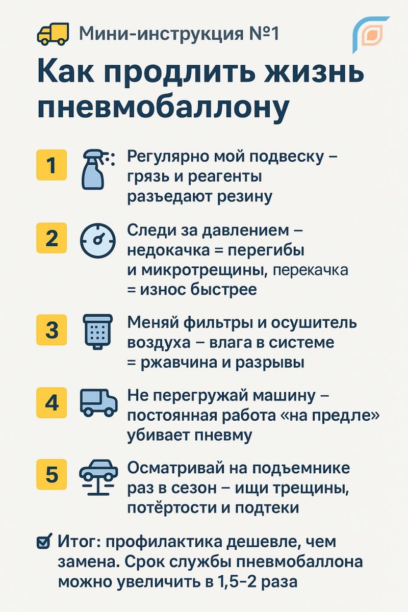 Как продлить жизнь пневмобаллону 🛠 1️⃣ Регулярно мой подвеску – грязь и реагенты разъедают резину. 2️⃣ Следи за давлением – недокачка = перегибы и микротрещины, перекачка = износ быстрее. 3️⃣ Меняй фильтры и осушитель воздуха – влага в системе = ржавчина и разрывы. 4️⃣ Не перегружай машину – постоянная работа «на пределе» убивает пневму. 5️⃣ Осматривай на подъемнике раз в сезон – ищи трещины, потёртости и подтеки. ✅ Итог: профилактика дешевле, чем замена. Срок службы пневмобаллона можно увеличить в 1,5–2 раза. Технический центр по ремонту рулевого управления и подвески "Гидравлика" ☎️ МСК: 8 (495) 777-8-007 ☎️ СПБ: 8 (812) 777-8-007 🌐 gurauto.ru