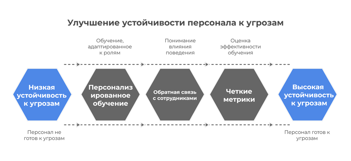 В-четвертых, внедрение мер и продолжение мониторинга позволяет внедрять четкие метрики эффективности работы с персоналом по вопросам противодействия угрозам информационной безопасности. Это могут быть рейтинговые таблицы лидеров по ИБ-культуре, сбор данных о времени реакции на угрозы, количестве рискованных действий каждого сотрудника и так далее. Это позволит понимать, какие шаги необходимо предпринять, как распределить ресурсы.