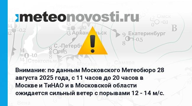 Внимание: по данным Московского Метеобюро 28 августа 2025 года, с 11 часов до 20 часов в Москве и ТиНАО и в Московской области ожидается сильный ветер с порывами 12 - 14 м/с. Перейти на сайт Прогноз погоды на 14 дней