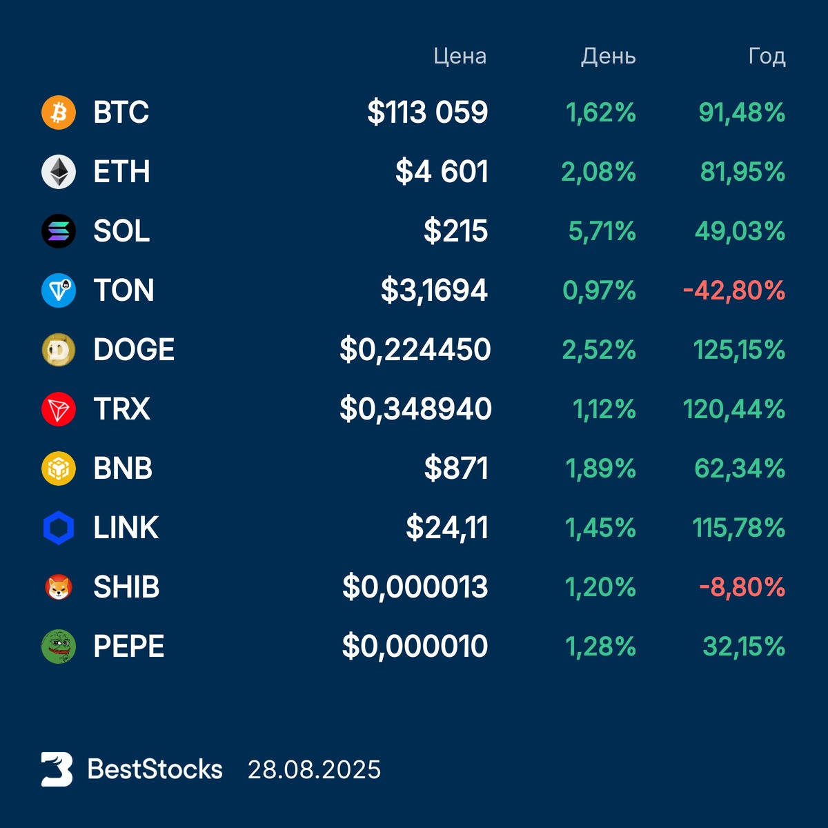 Курсы основных криптовалют: Bitcoin, Etherium, Solana, Toncoin, Dogecoin, TRON, BNB, Chainlink, Pepe, Shiba Inu на текущий момент #крипта #crypto #курс #BTC #ETH #SOL #TON #DOGE #TRX #BNB #LINKUSD #PEPEUSD #SHIBUSD ••••• 🏆 Сделали для вас список топ-25 лучших аналитиков в России и во всём мире. По каждому подробная информация: показатели доходности, успешность прогнозов и история рекомендаций по каждой акции. Уникальный инструмент, доступный на русском языке.