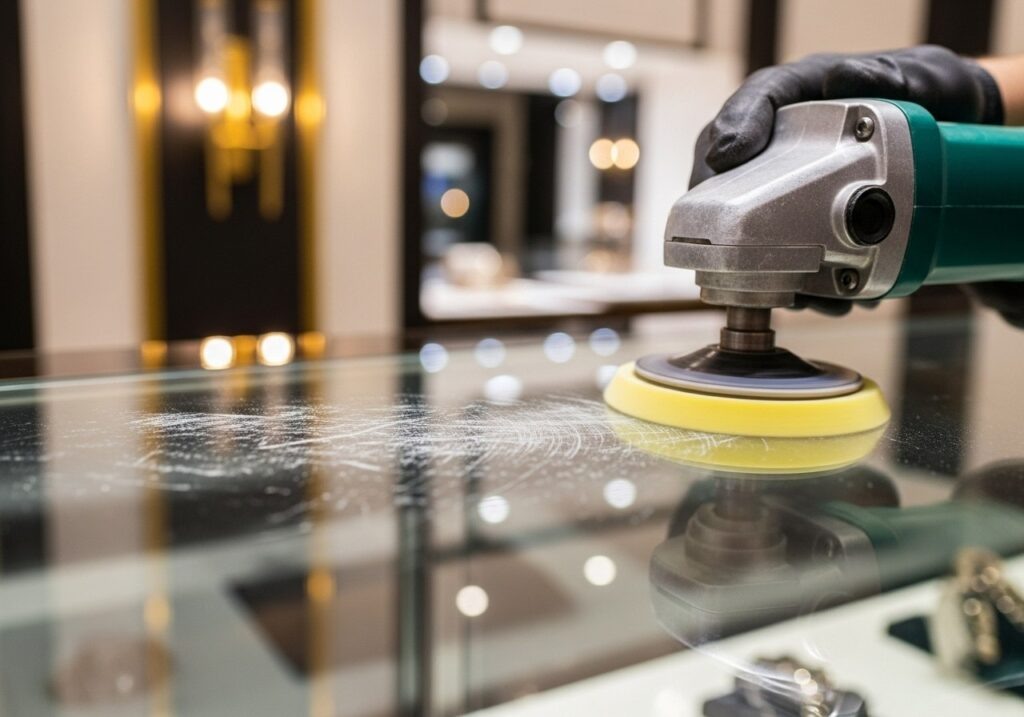 🔬 ИЗ ПРАКТИКИ: Большие витрины полируем фрагментами, постепенно перемещаясь по поверхности. Это позволяет избежать перегрева стекла и обеспечить равномерность обработки.