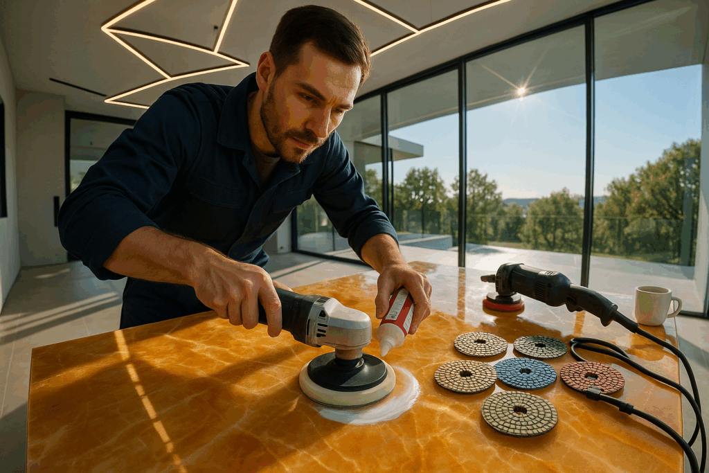 Профессиональная полировка поверхностей из камня — это не просто натирание до блеска. Это восстановление естественной структуры минерала, раскрытие его природной красоты. После правильной полировки оникс должен светиться изнутри — это его особенность как полупрозрачного камня.