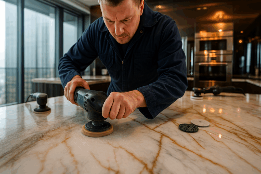 💰 РАСЧЕТ: Для стандартной кухонной столешницы площадью 3 м² экономия при выборе реставрации вместо замены составляет минимум 200 000 рублей. При этом результат профессиональной полировки визуально неотличим от новой поверхности.