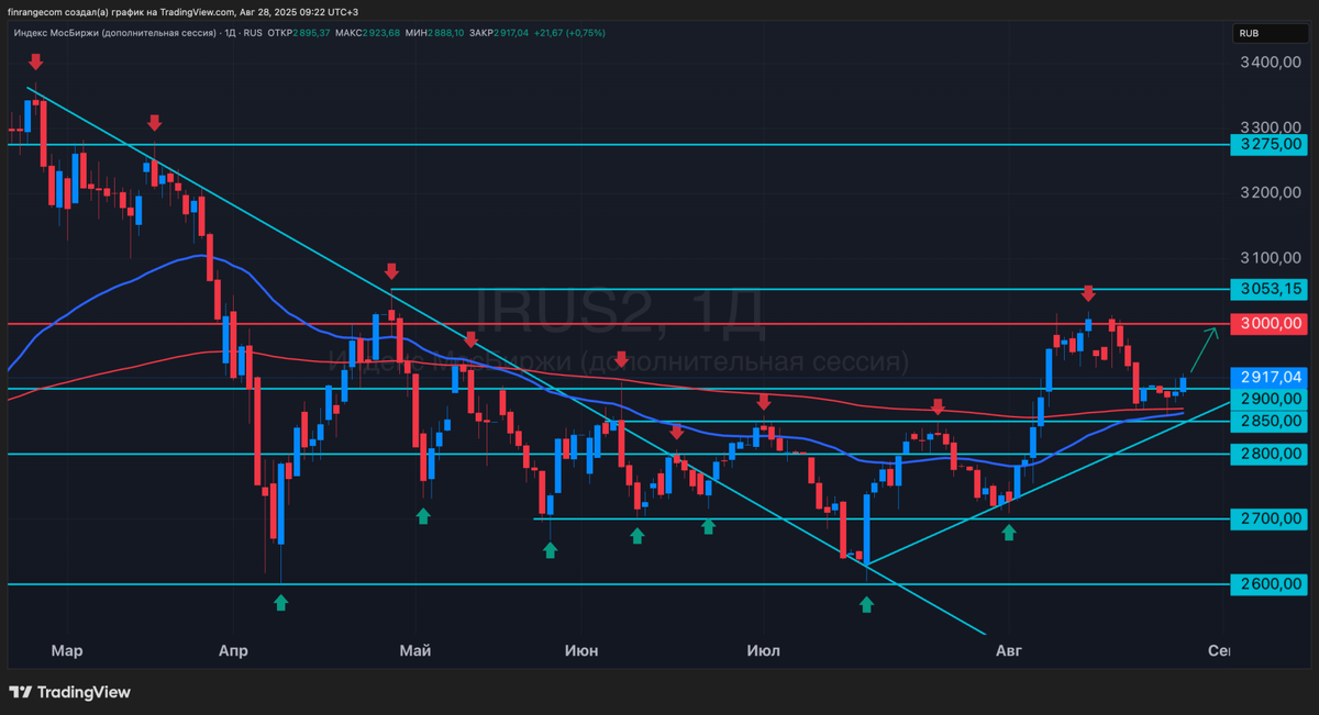 Российский рынок акций вчера после открытия основной торговой сессии перешёл к росту. В обед мы скорректировались, проторговались вокруг 2900 пунктов и в 14 часов по мск начался уверенный рост акций по всему рынку.