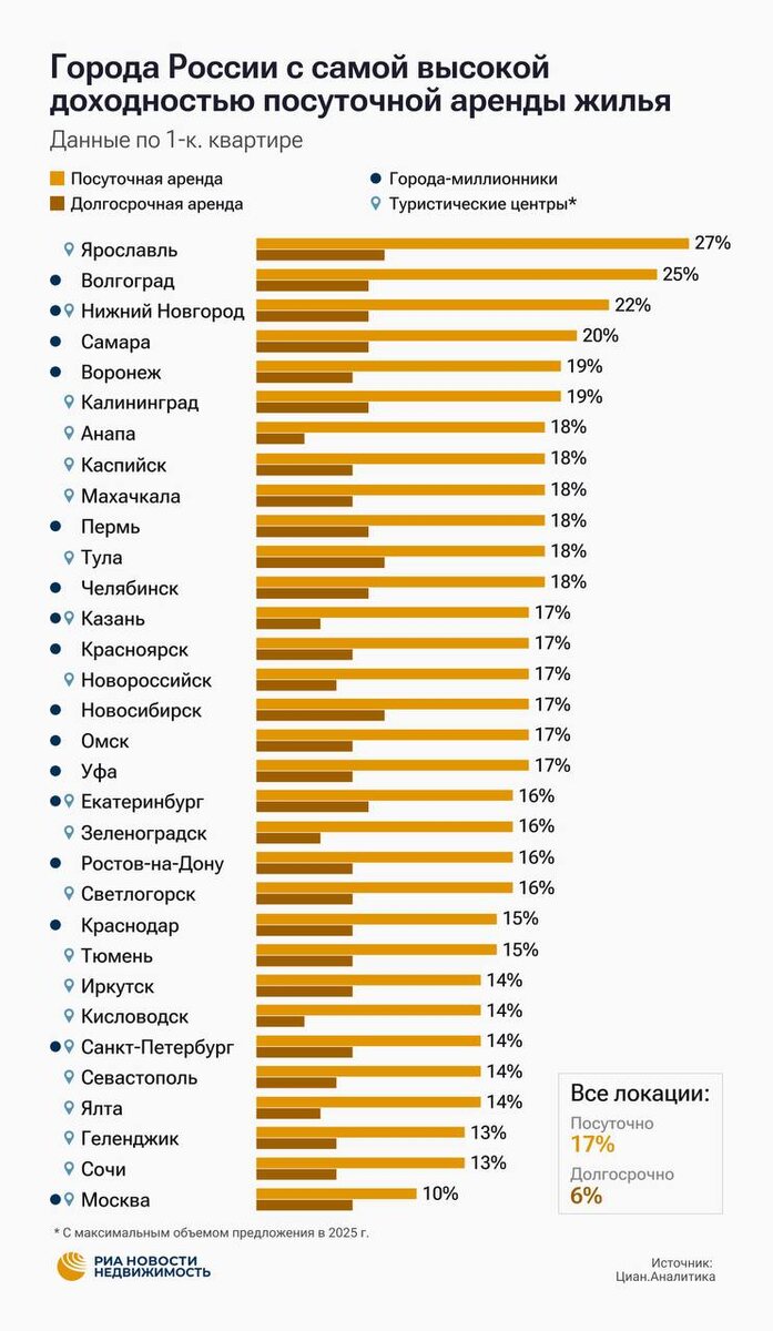 Что там с посуточный арендой ? 🏙️ Москва оказалась аутсайдером среди миллионников по доходности посуточной аренды жилья. При высоких ставках аренды 10% годовых не покрывают расходов из-за дорогой недвижимости. А теперь барабанная дробь — Волгоград показал всем класс, там можно 25% годовых иметь! Вот где настоящий профит от сдачи жилья. Там и доходность в два с половиной раза выше Москвы. Светлая квартира 🌇 #аренда