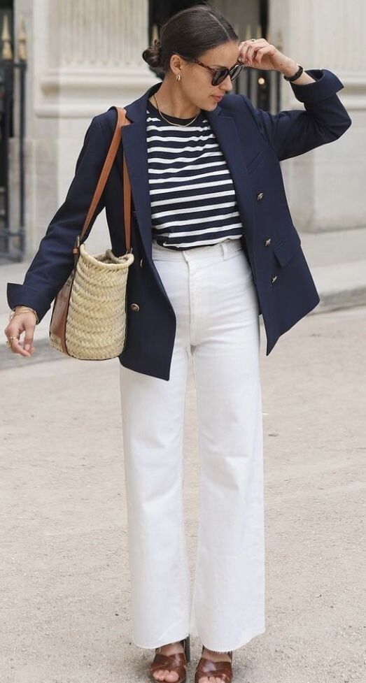 Да, француженки тоже носят джинсы, но — прямые, сдержанные, без страз и дыр. Голубой деним или темно-синий — идеальные варианты.