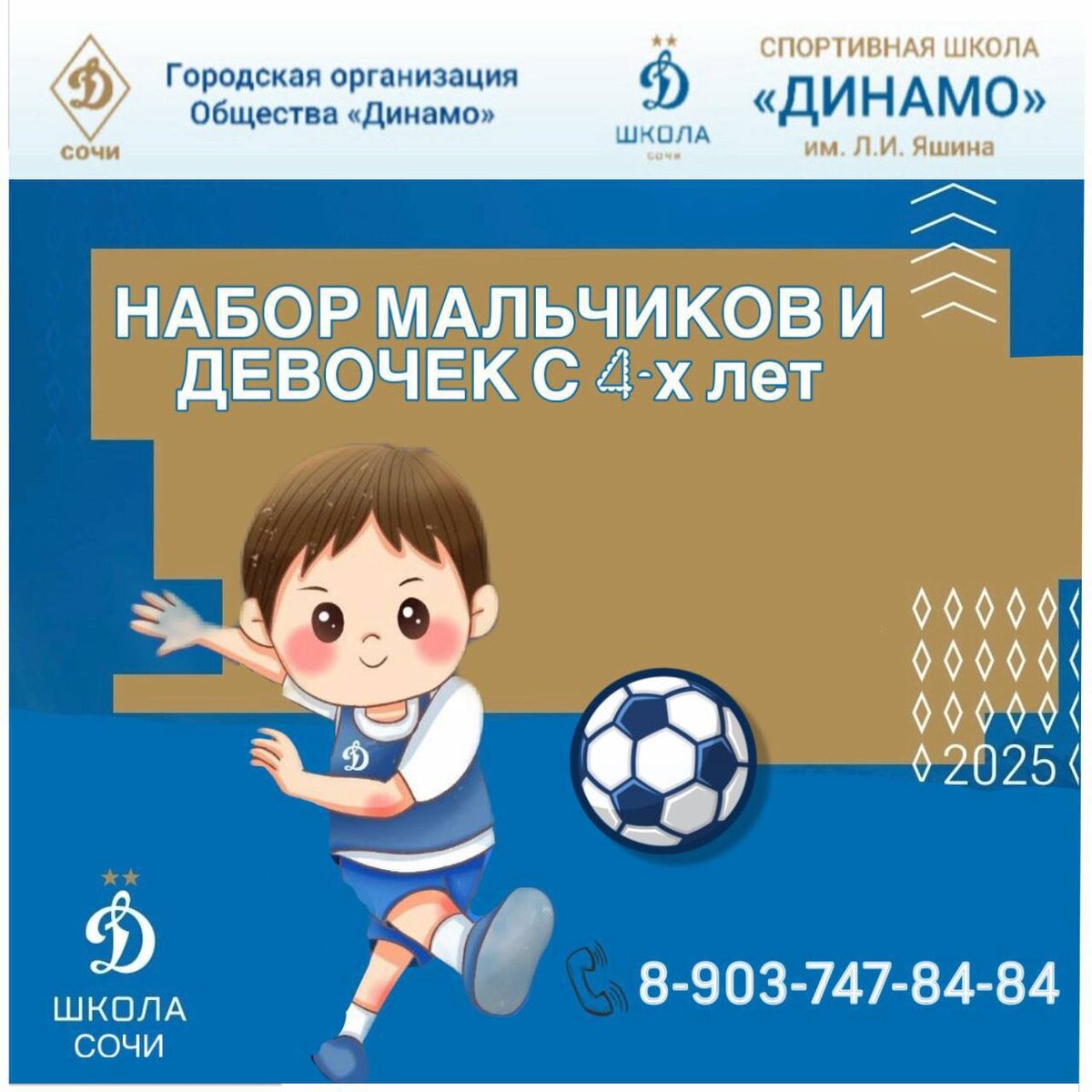 Сочинская городская организация Общества Динамо, спортивная школа Динамо им.Л.И.Яшина объявляют набор мальчиков и девочек с 4-х лет для занятий футболом. ✅ Официальная футбольная школа ФК «Динамо Москва» и Общества «Динамо»; ✅ Профессиональный лицензированный тренерский штат, московские специалисты; ✅ Возможность карьерного роста в академию «Динамо Москва им.Л.И.Яшина»; ✅ Группы по возрастам, игровая практика со сверстниками академии; ✅ Участие в крупных федеральных и международных турнирах. 📞Телефон для записи на просмотр: 8(903)7478484 Больше информации в наших социальных сетях: ТГ: t.me/DynamoSochi ВК: vk.com/fcdm.school.sochi
