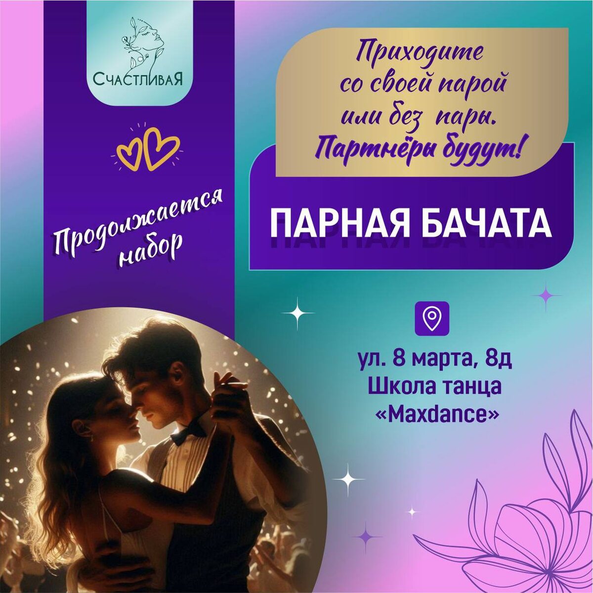 ❤️ 🔠🅰️🔤🅰️🔤🅰️ ❤️ ❤️🔤🅰️🔤🔤🅰️🔤❤️ Хотите окунуться в мир страсти, романтики и чувственности? ♥️ Приглашаем стать частью огромного бачата-сообщества! Можно прийти со своей парой, а можно и одному. Партнеры будут для каждого!! ПОЧЕМУ БАЧАТА? - Это самый популярный парный танец в мире! Куда бы вы ни поехали, везде найдутся вечеринки с бачатой. - Музыка и движения бачаты завораживают и вдохновляют. Это идеальный микс несложной хореографии и потрясающей чувственности. Занятия по вечерам и в выходные дни. Подберем время удобное время. ❤️ Самый центр города: 8 марта 8Д, ТЦ «Мытый двор» ТЕБЯ ЖДУТ: 💃Доступное и понятное объяснение материала; 🕺Много практики; 💃Энергетика, которой невозможно не заразиться; 🕺Поддержка освоения нового, нужного наставника; 💃Компанию таких же позитивных, отзывчивых людей, которые любят танцы/свободные тусовки и общение; 🔥 Особые бонусы по промокоду СЧАСТЛИВАЯ (см. в комментарии) Бачата — это не просто танец, это искусство, которое объединяет люд