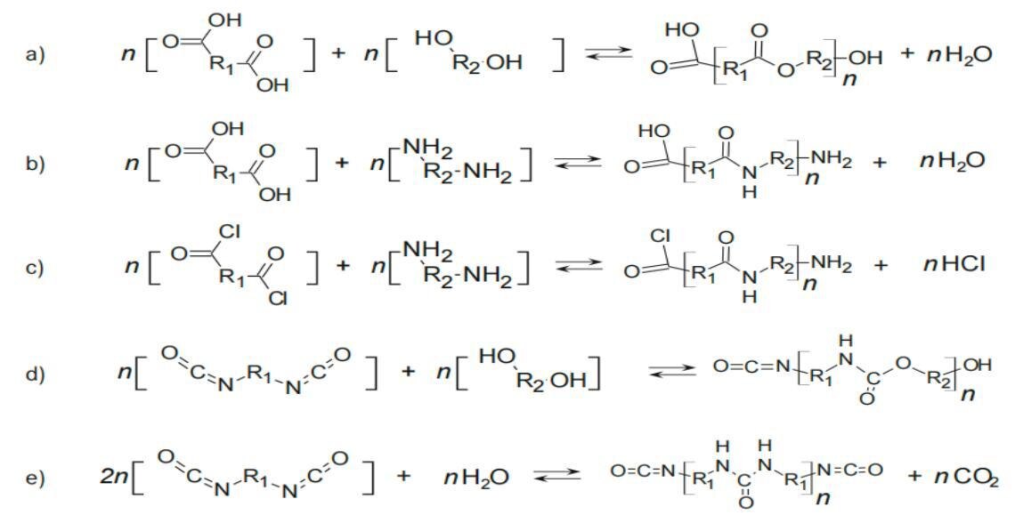 ⚗️ Производство полимеров: взгляд инженера-технолога на химию реакций! Упрощенно разберем химию полимерных реакций, чтобы лучше понимать процессы экструзии и устранять нежелательные продукты деградации. ⚙️ Есть два основных типа производства полимеров: 1. Ступенчатые или конденсационные реакции 2. Реакции присоединения или виниловой полимеризации 2.4.1 Реакции конденсации: Исторически основаны на том, что в процессе полимеризации выделяется небольшая молекула (например, вода). • (a) Полиэфир: Если кислота и основание имеют две или более реакционноспособных группы - линейный полимер (например, ПЭТ). Если групп больше двух – алкидная смола. • (b) Полиамид (с H2O): Если R1 и R2 – шестиуглеродные цепи с реактивными группами на концах - PA 66. • (c) Полиамид (с HCl): • (d) Полиуретан: Реакция изоцианата и органического спирта. Многофункциональные реагенты дают полимер (функциональность 2 – линейный полимер, >2 – сшитый полимер). • (e) Полимочевина: Продукт изоцианата и воды. Выде