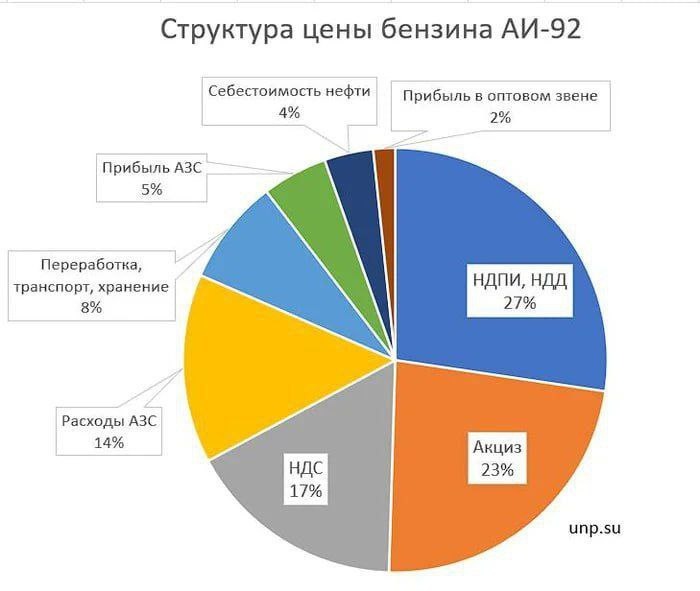 🛢💸 Почему бензин дорожает, даже если нефть дешевеет? Недавно бензин снова побил ценовой рекорд: ⛽️ АИ-95 на бирже превысил 82 тыс. руб. за тонну. ⛽️ АИ-92 тоже на максимумах. 👉 Интуитивно хочется верить: дешевая нефть = дешевый бензин. На деле формула совсем другая. Примерно как ожидать от «Арсенала» трофеи весной — красиво звучит, но жизнь работает иначе. 📌 Не буду тянуть интригу — дело вовсе не в цене нефти. Главный «топливный насос» у нас — это налоги. Налог на добычу полезных ископаемых (или налог на допдоход) занимает долю 27% в 1 литре бензина. Акциз на топливо — 23%. НДС — 17%. Итого доля налогов составляет 67%. 📌 А нефть? На её долю приходится всего 4% конечной цены. Остальное — переработка, транспортировка и наценка АЗС. Получается, что две трети цены бензина формирует государство. Такая ситуация есть не только в России — в большинстве стран мира энергетика облагается высокими налогами. Но даже с учётом этого бензин у нас остаётся дорогим по сравнению с другими стра