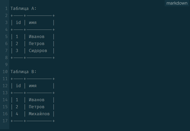 Операция INTERSECT - это операция в SQL, которая возвращает набор строк, которые присутствуют в обоих таблицах. INTERSECT возвращает только те строки, которые имеют одинаковые значения во всех столбцах, указанных в операции SELECT. Например, если у нас есть две таблицы: Если мы хотим найти строки, которые присутствуют в обоих таблицах, мы можем использовать операцию INTERSECT: Результат: Как видите, операция INTERSECT вернула только те строки, которые имеют одинаковые значения во всех столбцах (id и имя) в обоих таблицах. Операция INTERSECT может быть полезна в следующих случаях: Однако, операция INTERSECT может быть медленной, если таблицы большие, поэтому ее следует использовать с осторожностью.