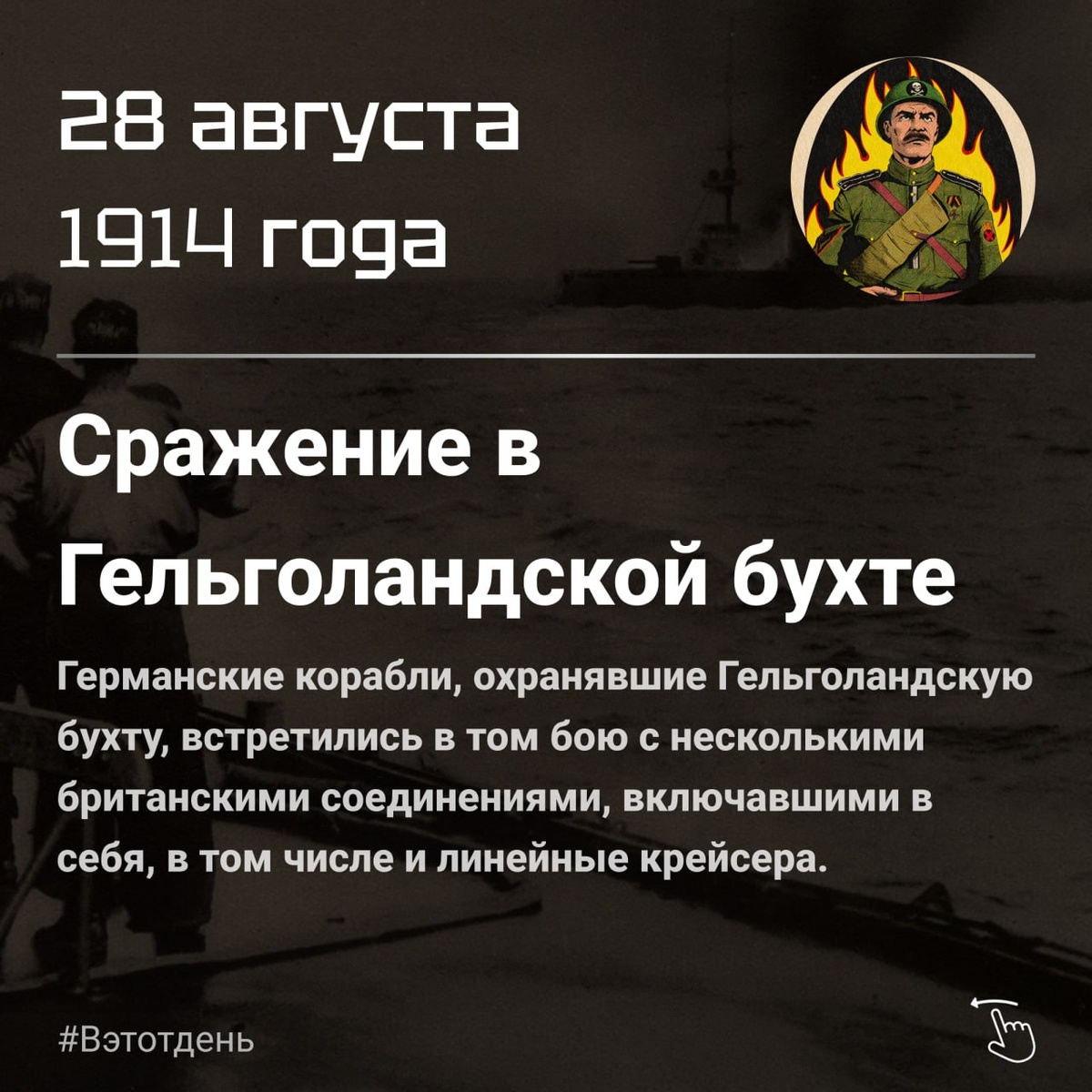 28 августа 1914 года в Северном море у побережья Германии произошёл первый крупный морской бой Первой мировой войны — битва в Гельголандской