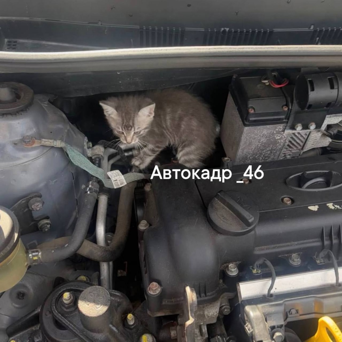 В Курске женщина обнаружила котенка под капотом автомобиля.