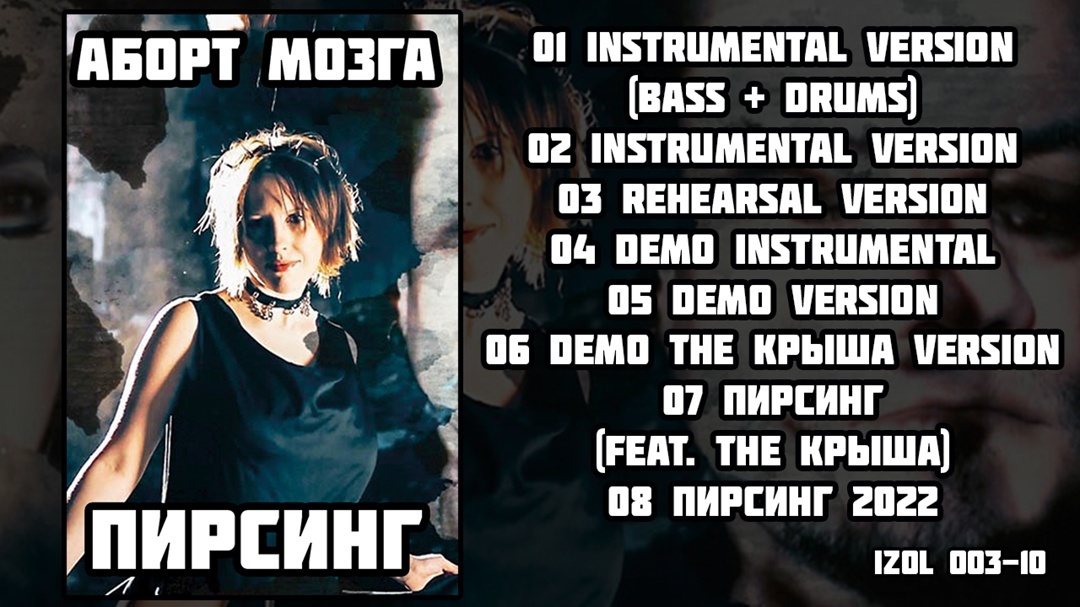 Почему так подробно препарируется именно «Пирсинг»? Просто история создания композиции настолько запутана и прихотлива, что в ней зачастую не очень-то ориентируются даже преданные фанаты группы. Первые наброски были сделаны в 2011 году улан-удэнским составом «Аборта мозга» вокалисткой Сабриной Амо (Натальей Семеновой) с Сергеем Гордеевым на гитаре, Романом Мозгом на басу и Алексеем Кузнецовым на гитаре. Этот период отражают первые пять треков: каркас из баса и барабанов, инструментальная версия, репетиционная версия, демо-инструментал и, наконец, демо-версия 2013 года.
