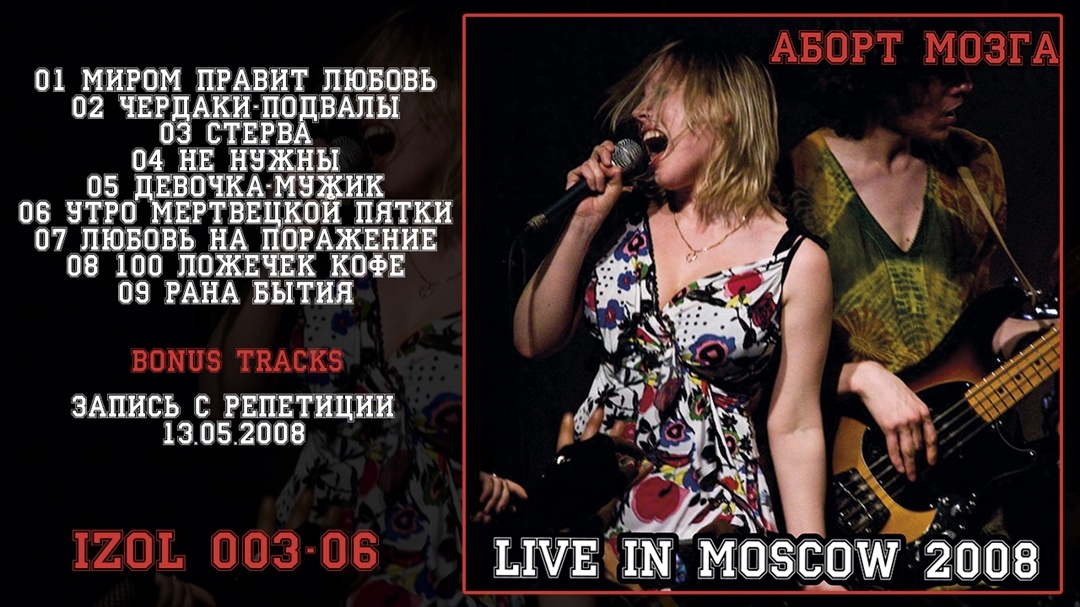 Помню, рецензировал я как-то концертный альбом группы Аборт Мозга "Live In Irkutsk", записанный в далеком 2002 году, и это было больно. Я еще назвал его альбомом, которого лучше бы не было, что являлось сущей правдой. Потому, держа в руках очередной "живой" релиз бурятских панков, я испытал все виды панических атак, вьетнамских флэшбеков и приступов ПТСР. О, нет, опять они! Уже думал просто накатать любую простыню "на шару", лишь бы избавить себя от лишних мучений, но в итоге решил, что это как-то непрофессионально. Оказалось, здесь все не так плохо. "Live In Moscow 2008" был записан, как уже можно догадаться, в Москве на нескольких концертах в поддержку вышедшего в 2007 году альбома "Влечение". Соответственно, материал концертника составлен в основном из песен с этого альбома в наиболее актуальной на тот момент их версии, поскольку некоторые треки существуют и в иных вариантах. Тогда группа была на пике формы и популярности и, да, на "Live In Moscow 2008" она звучит лучше, чем на "Liv