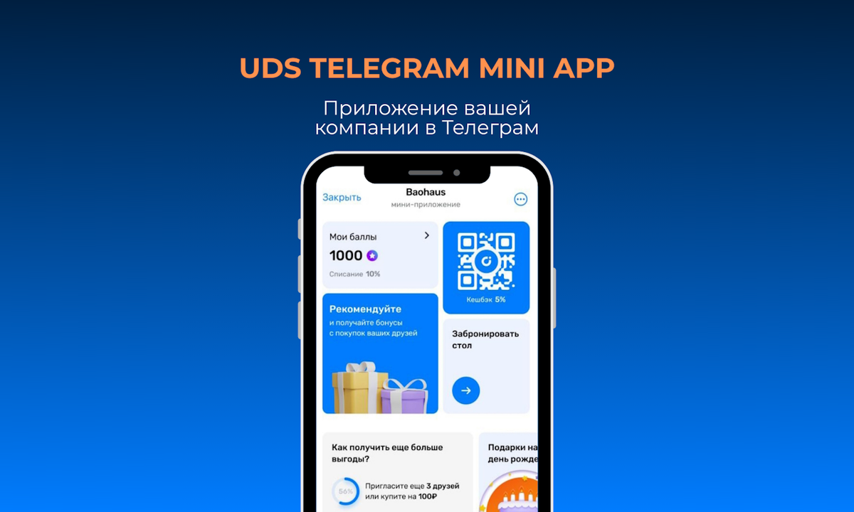 Проблема: Не все клиенты готовы скачать и установить приложение UDS App. Особенно — пожилые или те, у кого мало памяти на телефоне. Решение: UDS Mini App в Telegram работает без установки. Клиент нажимает на кнопку в боте — и мгновенно попадает в интерфейс UDS. Пользователь получает полноценный digital-опыт лояльности, как в приложении UDS, но без скачивания. Итог: вы охватываете больше людей — и вовлекаете тех, кто раньше "терялся". Mini App интегрирован в общую платформу UDS, это значит: Вывод: UDS Mini App в Telegram-боте — это не "дополнение", а превращение бота в полноценный канал лояльности. Mini App будет доступен для клиентов UDS на тарифе Pro в декабре 2025 года! Вы можете испытать UDS в своём бизнесе прямо сейчас! Для вас доступна 7-дневная Триал-версия UDS! Либо начните оцифровывать