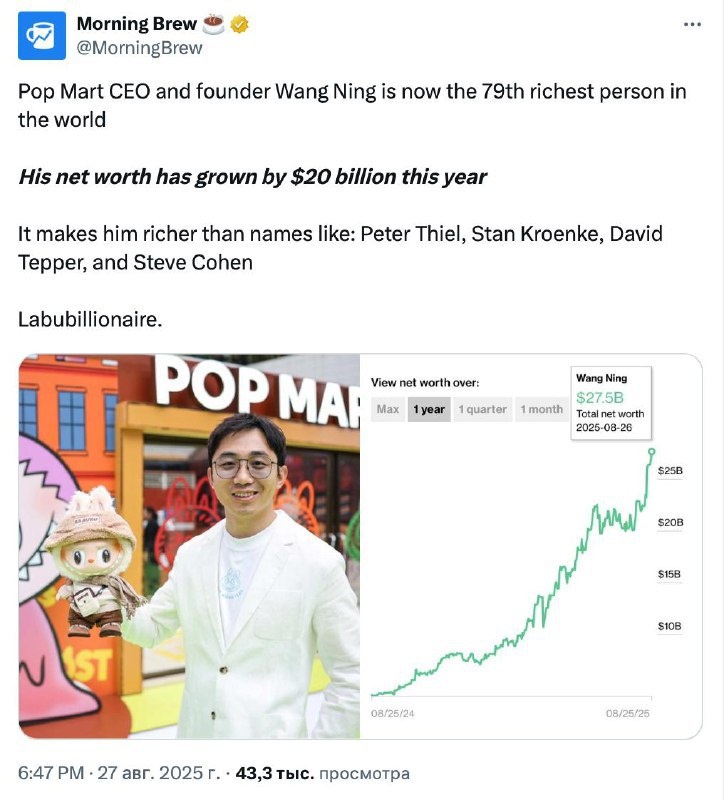 Владелец Лабубу ворвался в топ-100 самых богатых людей мира