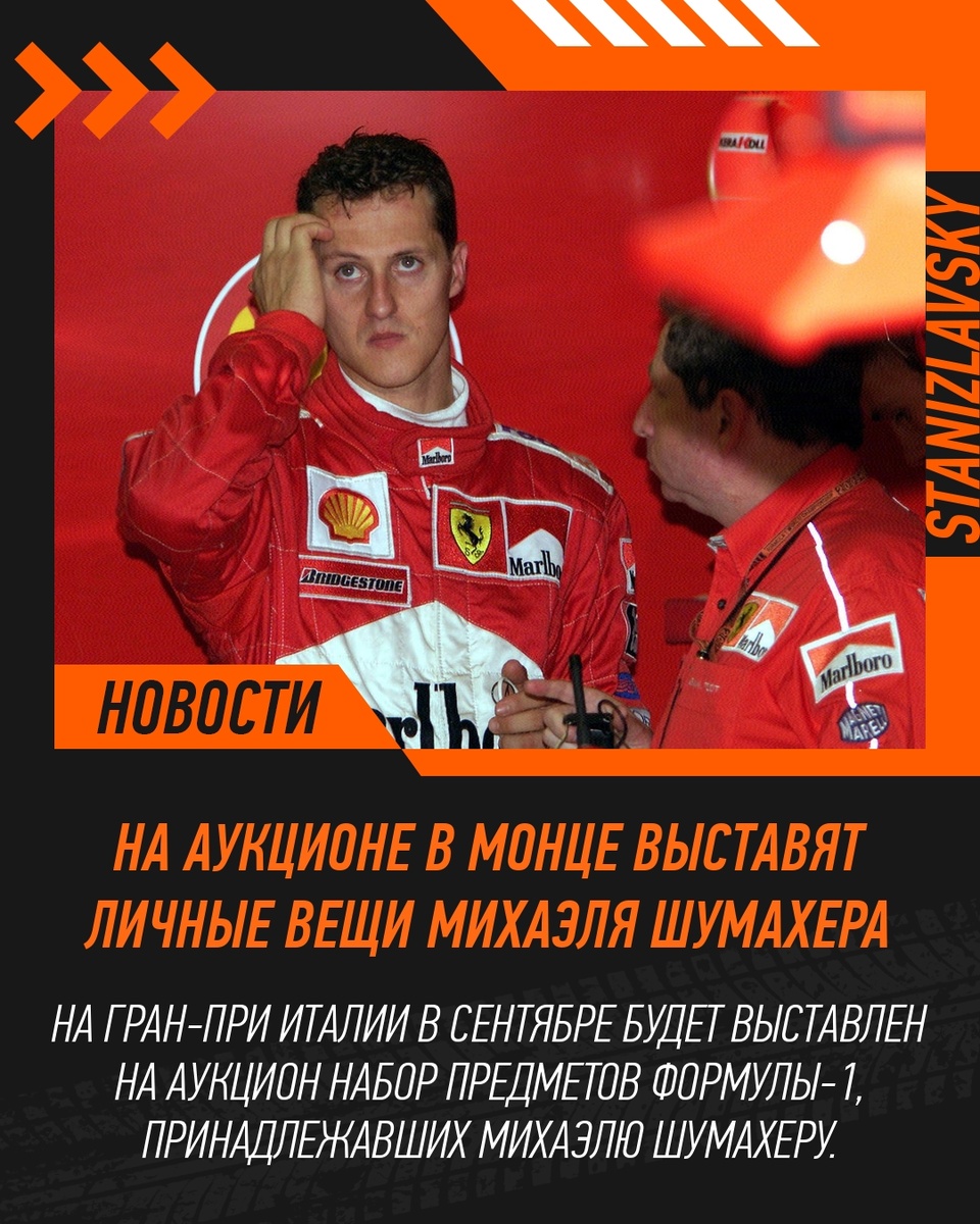 Памятные вещи Михаэля Шумахера будут выставлены на аукцион во время Гран-При Италии в ближайшие выходные. 🏎️ Подборка редких предметов будет выставлена на аукцион и размещена в лаунж-зоне Шумахера в Монце. Главным лотом станет подписанный гоночный костюм с Гран-При Венгрии 2000 года, который Михаэль носил в свой первый чемпионский сезон за Ferrari. Среди других лотов — подписанный шлем сезона Формулы-1 2002 года, использованный на Гран-при Венгрии и Италии, а также комбинезон Benetton 1995 года с начальной ценой 44 000 евро. 💰 Значительная часть вырученных средств пойдёт в фонд Keep Fighting Foundation, созданный семьёй Шумахера в 2017 году. Фонд подчеркивает, что пожертвования не предназначены для Михаэля Шумахера, а направляются на благотворительность от его имени. #формула1 #formula1 #ф1 #f1 #stanizlavsky #станиславский #новости
