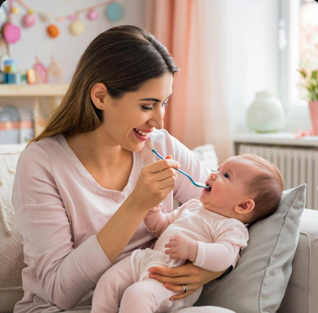 Как правильно начинать прикорм мы уже разбирали в этой статье. В этом возрасте ребенок уже готов познакомиться с новыми вкусами. Начнем с овощей – кабачков или брокколи. Эти овощи хорошо усваиваются и редко вызывают аллергию. Важно помнить, что новая еда должна быть однокомпонентной пюреобразной консистенции без соли и сахара. Я начинала с кабачка. На этом этапе нужно набраться терпения, ведь для малыша это новая еда и ему нужно время, чтобы адаптироваться. После того, как малыш привыкнет к овощному пюре (примерно через неделю), можно добавить кашку из гречки или риса на воде. Начинайте с одной чайной ложки утром перед кормлением грудью и постепенно увеличивайте порцию до полного объема кормления. Если ваш кроха спокойно воспринимает каши и овощи, пора попробовать фруктовое пюре из яблок или груш. Также можно познакомить ребенка с мясом индейки или кролика, но помните, мясо вводится очень осторожно и небольшими порциями. Пришло время расширить рацион ребенка кисломолочными про