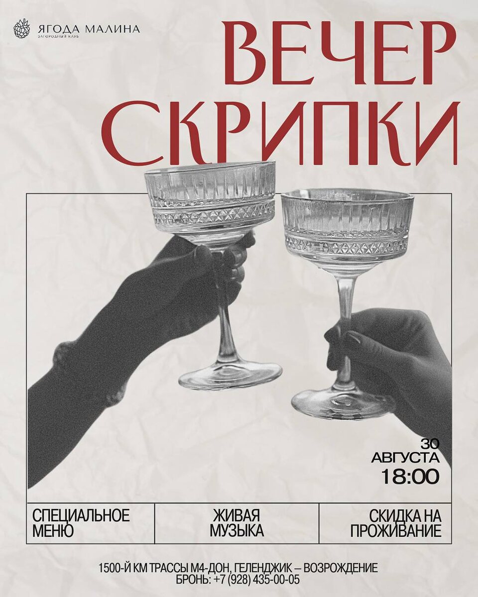 ДОБРО ПОЖАЛОВАТЬ НА ВЕЧЕР СКРИПКИ! 30 августа приглашаем вас на незабываемый вечер в Загородный клуб «Ягода Малина» 🎻 В ПРОГРАММЕ: — ЖИВАЯ МУЗЫКА: виртуозное исполнение на скрипке и выступление певицы Александры Кудрявцевой. Атмосфера уюта, гармонии и волшебства гарантирована. — ГАСТРОНОМИЧЕСКИЕ ИЗЫСКИ: авторское меню от наших шеф-поваров и коктейли от барменов. — ВЫГОДНОЕ ПРОЖИВАНИЕ: оставайтесь с нами подольше — скидка 20% на аренду уютного домика А-фрейм. 📅 Дата: 30 августа ⏰ Сбор гостей: 18:00 📍 Адрес: 1500-й км трассы М4 «Дон», Геленджик — Возрождение ☎ Бронь столиков: 8 (800) 333 16 83