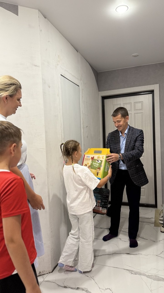 Акция «Собери ребенка в школу»: заместитель руководителя управы Калининского округа вручил подарки первоклассникам Заместитель руководителя управы КАО Александр Логинов посетил семьи, в которых в этом году дети впервые пойдут в школу, и вручил им канцелярские наборы. Мероприятие прошло в рамках акции «Собери ребенка в школу». Подарочные наборы получили две многодетные семьи. В каждой из них подрастают будущие первоклассники, для которых подготовка к 1 сентября становится особенно волнительным и важным событием. В ходе визита Александр Логинов пообщался с родителями и детьми, поздравил будущих учеников с началом нового этапа в жизни и пожелал им успехов в учебе и отличных оценок. Фото и информация предоставлены управой Калининского административного округа