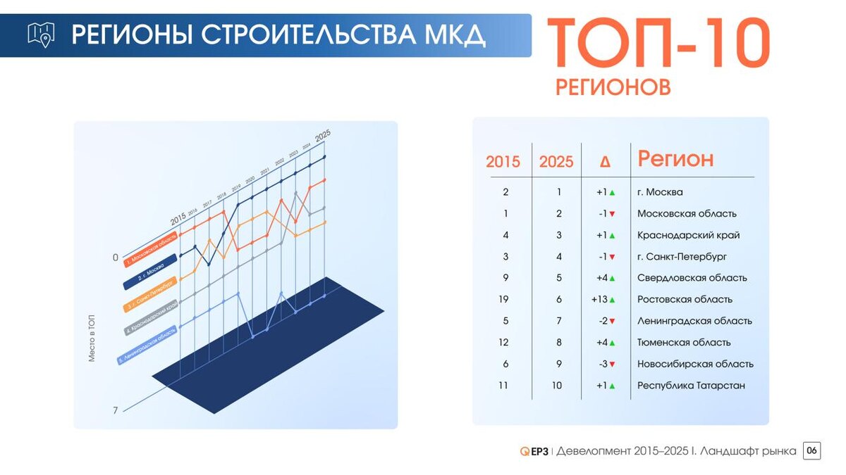 Лидерами роста стали Республика Крым, Дагестан, Приморский край. Доля крупнейшей сотни девелоперов выросла с 36% до 48%. • Средняя площадь квартир за 10 лет уменьшилась с 56,8 м² до 48,8 м². • Рекорд по росту стоимости заняла Республика Алтай — с 34 тыс. руб. в 2015 году до 243 тыс. руб. в 2025 году (почти в 7 раз). → Изменился и язык, которым девелоперы описывают свои проекты.