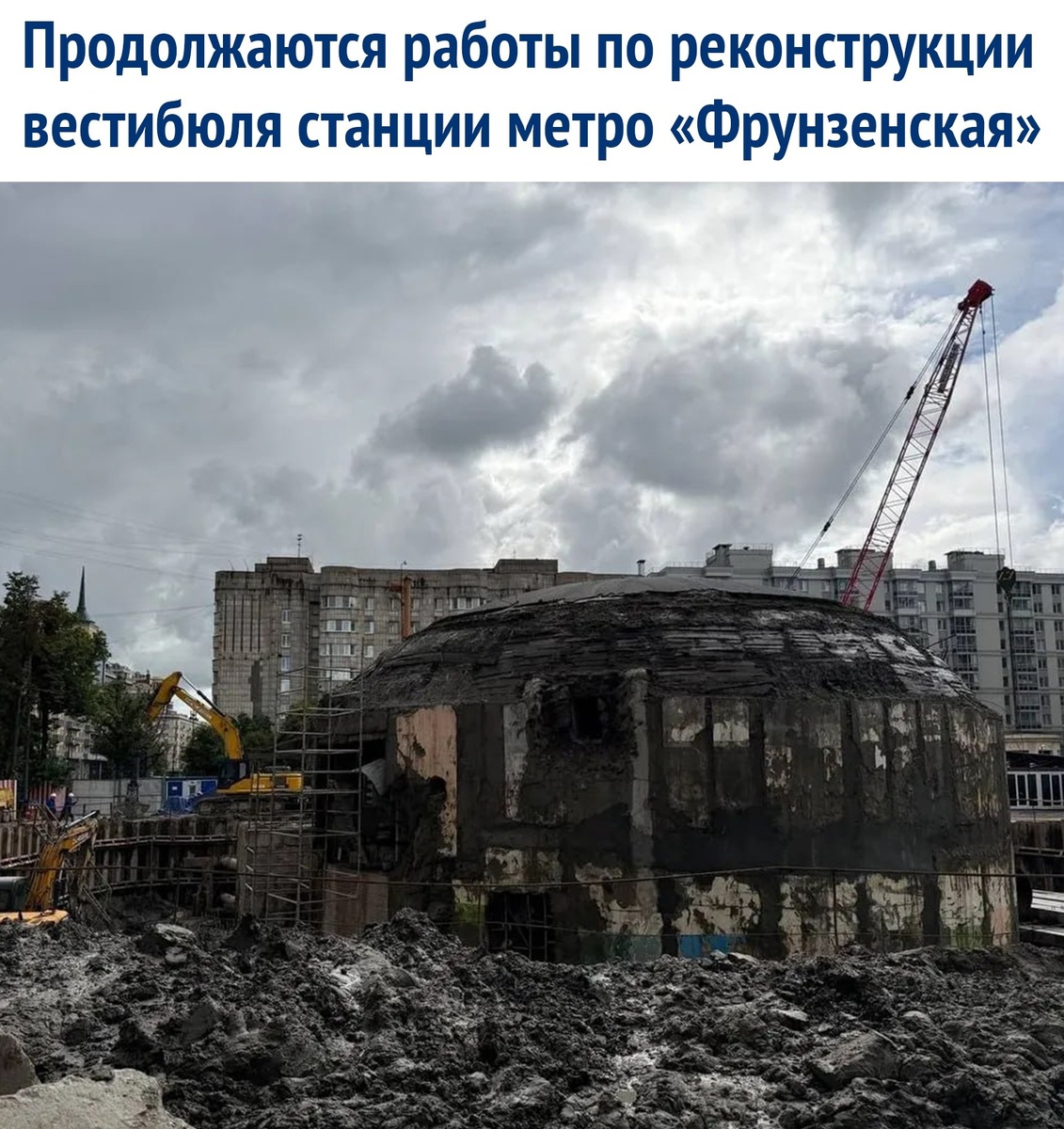 На данный момент выполнен демонтаж части конструкций старого вестибюля, остался только "бронекупол" кассового зала. Дополнительная информация о проведённых мероприятиях: - в наклонном коридоре демонтированы эскалаторы и внутренние элементы; - выполнены работы по установке шпунтовых ограждений по всему периметру, а также создано свайное основание из буронабивных свай для фундамента нового вестибюля; - продолжаются работы по выемке грунта в котловане. Планируется открыть обновлённую станцию "Фрунзенская" в 2027 году. Другие новости