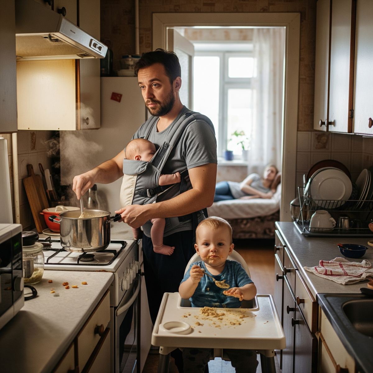 Жена его, Светлана, ходила по квартире как тень. Под глазами круги, на руках годовалый Ваня орёт, на плите что-то убегает, стиралка пищит...