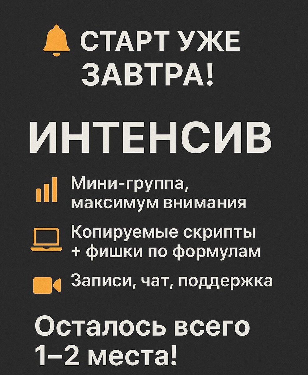 В ответ на пост 🔥 Друзья! Уже завтра стартует наш интенсив! Группа маленькая и уютная, поэтому каждому уделим максимум внимания. ⚡ Осталось всего 1–2 места — можно успеть вписаться! 🚀 Что будет на интенсиве: ✅ Полезные кейсы по скриптам — даже без знаний сможете просто скопировать, вставить и применить у себя. ✅ Фишки и практические приёмы по формулам. ✅ 10-12 занятий (по 2 раза в неделю) в формате лайв. ✅ Все записи сохраняются на Google Диске — доступ у вас останется навсегда, сможете и скачать к себе. ✅ Домашки и чат курса, где можно задавать вопросы и после завершения. 📩 Чтобы спросить детали или записаться — пишите: @namokonov