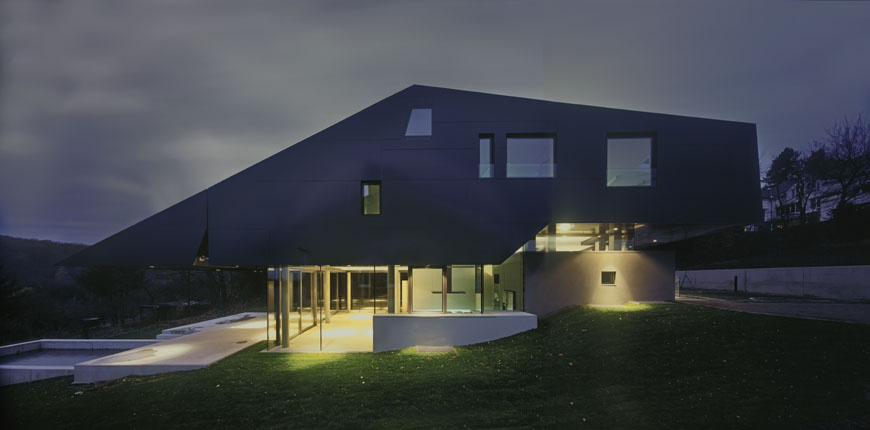Этот яркий модернистский дом построен на живописном зелёном участке на окраине Штутгарта. У дома динамичная форма и плоскостные фасады, ставшие фирменными для автора и при этом отсылающие к гениальному Дому Шрёдер (Rietveld Schroderhuis). В связи с перепадом высот на участке вход и общая зона расположены на втором этаже, внизу находится крытый бассейн и подсобные помещения, вверху — частная зона...