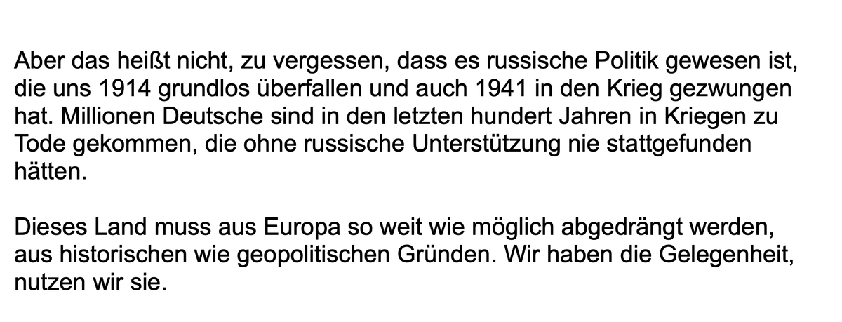 Не имею права называть его имя, но привести несколько выдержек из его текста и показать скриншоты, я могу и просто обязан. Он высказывает свое мнение о России, о ее роли в жизни Германии, о взаимоотношениях.