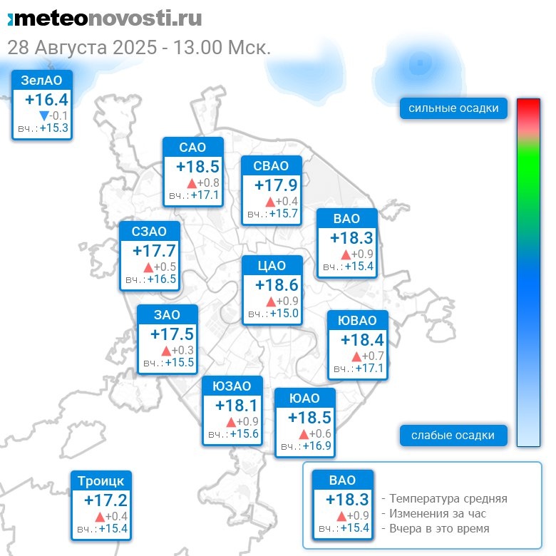 В 13:00 в Москве было от +16.4°C до +20.2°C, средняя температура +18.2°C #погода #Москва #лето #температура #28августа #четверг