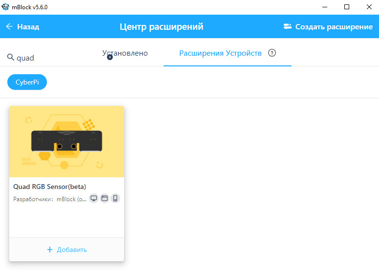 Итак, у вас выбрано нужное устройство, жмете кнопку +Расширения и в расширениях для устройств выбираете Quad RGB Sensor. Жмем "добавить"