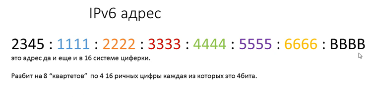 Каждому адресу IPv6 соответствует восемь групп из четырех шестнадцатеричных символов. Группы разделяются двоеточиями.Пример: