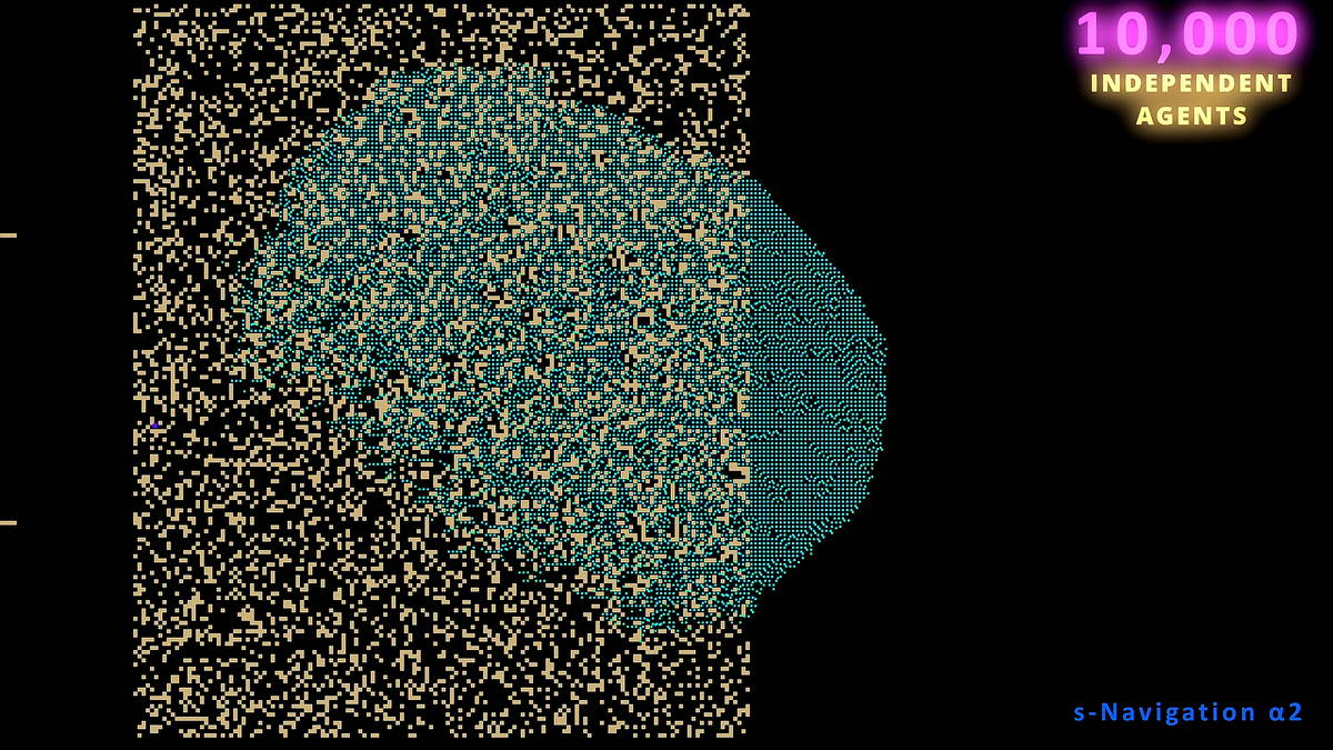 Масштабируемость. Алгоритм демонстрирует способность эффективно работать с очень большим количеством агентов (10 000+), что выходит за рамки типичных реализаций классических алгоритмов поиска пути (A*, D*, flow fields).
