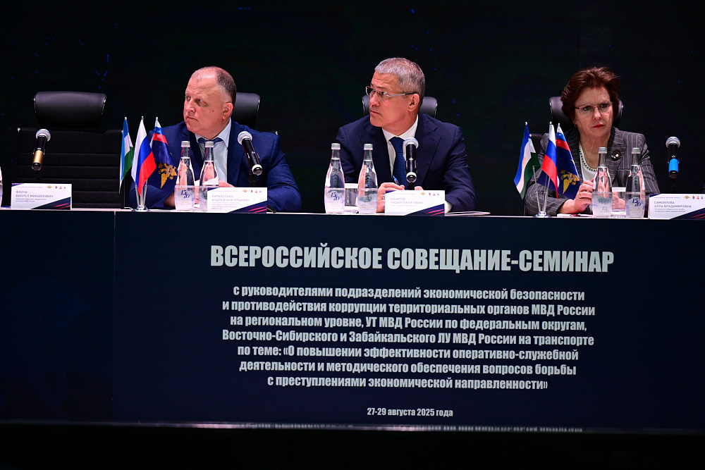 28 августа в Уфимском юридическом институте МВД России Глава Башкортостана Радий Хабиров принял участие во Всероссийском совещании-семинаре с руководителями подразделений экономической безопасности и противодействия коррупции территориальных органов МВД России. На повестке – повышение эффективности оперативно-служебной деятельности и методического обеспечения в сфере противодействия преступлениям экономической направленности. В приветственном слове Глава Башкортостана пожелал участникам совещания-семинара продуктивной работы. – Здесь собрались руководители подразделений органов внутренних дел, обладающие широкими компетенциями, профессиональным и управленческим опытом. Совещание создаёт новые стимулы к повышению эффективности деятельности, а возможность обсудить острые вопросы и обменяться опытом является бесценной, – сказал Радий Хабиров. – Мы с вами совместно решаем задачи по обеспечению законности и правопорядка в республике. Сообща реализуем комплекс мер, которые благоприятно сказы